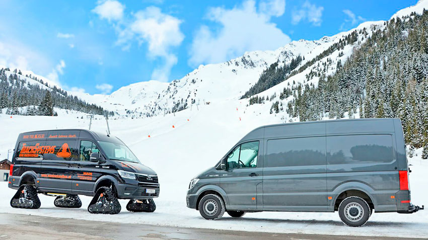 Незадолго до демонстрации TGE 3.180 4x4 combi компания MAN рассказала историю своего клиента – компании Bayerische Zugspitzbahn Bergbahn AG (BZB), которая управляет рядом ресторанов в немецких Альпах и располагает парком горных транспортных средств, включая зубчатую железную дорогу до самой высокой вершины Германии – горы Цугшпитце высотой 2962 м. Компания стала использовать фургоны MAN TGE 4x4 для снабжения своих альпийских ресторанов, рассчитывая на их полный привод для облегчения движения по гравийным, зачастую крутым подходам к своим объектам. Теперь же их транспортное обслуживание станет еще надежнее, так как движители TrackSystems помогут этим фургонам выполнять свои обязанности в в самую снежную зиму.