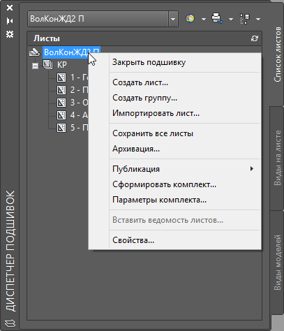 Список статей ← ссылка кликабельная После перенумерации или переименования листов в подшивке нужно пересохранить файлы, содержащие эти самые листы, чтобы не возникало ошибок в полях при печати. Можно конечно и вручную открывать каждый чертёж и сохранять его, но есть команда, которая автоматизирует этот процесс. Щелчок правой кнопкой мыши на названии подшивки в диспетчере подшивок. Сохранить все листы Запустится процесс сохранения, который можно прервать в случае необходимости. ОК Список статей ← ссылка кликабельная