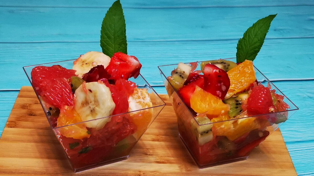 Сочные, сладкие, вкусные фрукты и ягоды соберутся в одном блюде. Идеальный фруктовый десерт для жаркого дня или просто для поднятия настроения. Ингредиенты: Для салата: Банан – 1шт Киви – 2шт Апельсин – 1 шт. Грейпфрут – 1 шт. Клубника – 5 шт (крупная) Для соуса: Мёд – 2 ст. л. Лимонный сок – 2 ст. л. Фундук – 10 г. Мята или мелисса. Все фрукты должны быть охлаждены и перед приготовлением их необходимо хорошо помыть. Банан отчищаем от кожуры и нарезаем на кружочки. Киви нарезаем кубиками или произвольными средними кусочками. Грейпфрут отчищаем от кожуры и с каждой дольки снимаем белую пленку, измельчаем и отправляем к другим фруктам. Апельсин отчищаем и нарезаем треугольниками. Клубнику делим на четвертинки. Салат готов, переходим к заправке. Для начала с помощью блендера измельчаем фундук или другой орех. Мёд растапливаем до жидкого состояния, добавляем сок лимона и измельченный фундук. Измельчаем мяту или мелиссу, предварительно удалив центральную прожилку. Перемешиваем соус и заправ