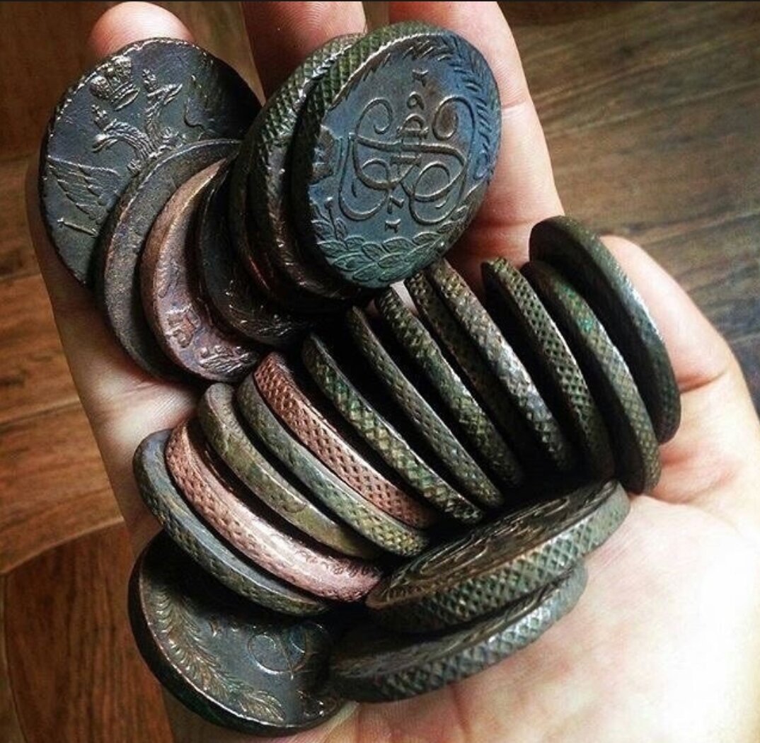 Патина на медных монетах бывает тёмно-зеленого или черного цвета. Иногда на монетах встречается патина темно-коричневого или черного цвета. В более редких случаях на монетах встречается патина темно-красного, светло-коричневого или светло-зеленого цвета и в очень редких случаях ярко-синего или ярко-оранжевого цветов. Цвет патины зависит от того, из какого металла или сплава сделана монета, а также от климатических условий местности, где она находилась. По цвету патины можно определить, где находилась монета и какие события она пережила, то есть узнать ее историю, которую невозможно выяснить каким-либо другим способом. Один из показательных примеров — это пожары. По внешнему виду патины можно определить, находилась ли монета вблизи от огня или же, наоборот, была далеко. Более того, если она побывала в пожаре, то можно даже установить, какого рода он был и был ли огонь резко затушен водой или долго тлел. Зеленая — один из основных видов патины покрывающей медные монеты. Сульфат меди и