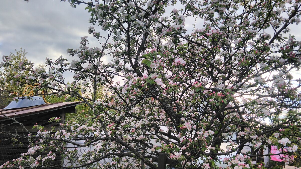 Ну, я не совсем уверена. Возможно, он себе её подарил. В любом случае до сих пор не могу поверить такому счастью. Десять лет канючила, так то места на участке нет, то яблоки в магазине есть, то он яблоки не ест, то лучше он малину разведет, то у тебя уже смородина есть. Малину кстати развел, нашел место. А смородина и даже крыжовник не считаются, они нам достались в наследство от первых владельцев участка. Этим кустам по тридцать лет и вожусь я с ними сама не знаю зачем. Они прикольные и умиляют меня своей живучестью. С местом у нас действительно проблемы. На половине участка настоящая тайга и даже речи быть не может о том, чтобы её подвинуть. Нашу тайгу мы оба любим. Недавно прикупили соседский участок, чистое болото. Любить его особо не за что, но рукам покоя не дает. Все сухие островки, которые успели отсыпать, уже засажены картошкой. Картошка — это святое. Под яблоню опять места нет. На фото в заголовке статьи соседская яблоня, вид из окна нашей времянки: Красиво цветет, правд