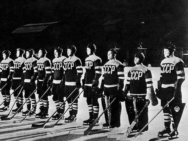 Как это было?! В 1954 году, сборная СССР первый раз принимает участие в своё первом чемпионате мира по хоккею! Проходил чемпионат мира в Стокгольме (Швеция). Это был 21-й чемпионат мира , в 1954 году в нём приняли участие 8 команд (СССР, Чехословакия , Финляндия, Швеция, Канада, Норвегия , ФРГ / Германия, Швейцария) 8 место - Норвегия 1 победа над швейцарией. 7 место - Швейцария 2 ничьи над ФРГ и Финляндией . 6 место - Финляндия 1 победа над Норвегией и одна ничья со Швейцарией. 5 место - ФРГ 2 победы над Финляндией и Норвегией 1 одна ничья со Швейцарией. Интересный факт: За время всего чемпионата было заброшено 222 шайбы. И вот мы подошли к самому сладкому! 4 место - Чехословакия 4 победы (ФРГ,Финляндия, Швейцария, Норвегия) 3 место - Швеция одно поражения сборной Канады(0:8) и одна ничья с СССР (1:1). 2 место - Канада одно поражение сборной СССР 7:2. 1 место - СССР 6 побед и всего 1 ничья со шведами. Сборная СССР показала блестящую игру и сразу завоевала золотые медали!