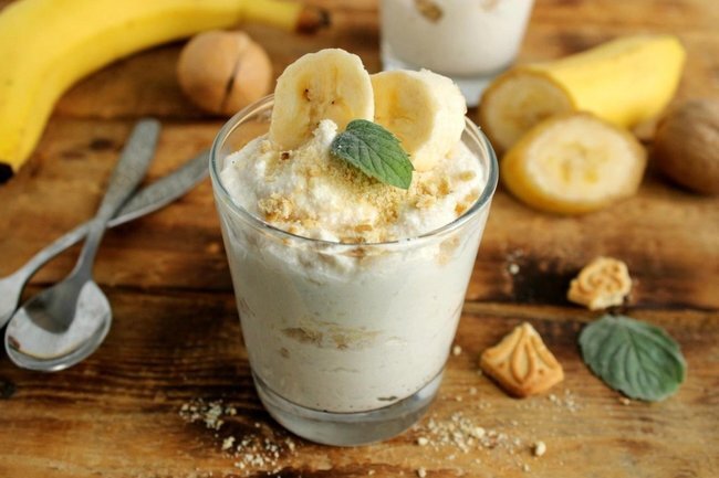 - С помощью блендера смешать 200 грамм творога, 2-3 нарезанных банана и 3 столовых ложки сгущенного молока. Взбить до однородного состояния.