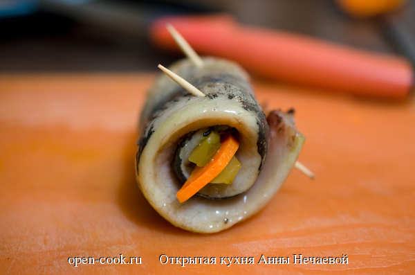 Поначалу эта закуска зацепила меня названием, я его никогда не слышала. Но любимая Википедия подсказала, что “Рольмопс, роль-мопс — маринованная сельдь, скрученная в рулетики. Рулоны скрепляются деревянными палочками. Внутрь добавляют корнишон или лук.