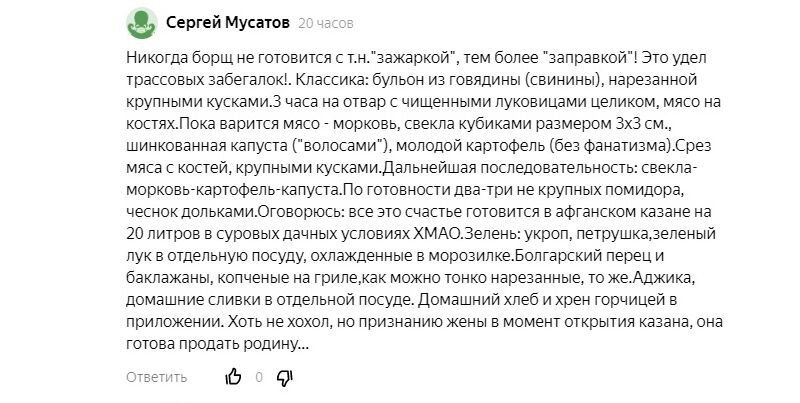 Кипит вода в морях". Л. Кэрролл "Морж и Плотник" Сегодня о еде, но не о рецептах хотя и о них тоже. Сегодня про "вообще" и " в частности". Время от времени всем, кто "готовит" еду на Дзене прилетают комментарии типа вот этого: Я не знаю что именно движет этими людьми, чесслово не знаю! Может желание поделиться радостью от владения "афганским казаном", может радость за свою Радость, которая счастлива вместе с ним(и это так здорово на самом деле когда твои близкие тобой восхищаются!), может еще какое желание, не знаю, но есть же в конце-то-концов определенные правила в приготовлении того или иного блюда!!! Я сам частенько нарушаю всевозможные правила, вернее не так, не правила, я стараюсь не отступать от технологии приготовления блюда. Я могу допустить пересортицу ингредиентов при соблюдении технологии приготовления блюда. Вместо баранины положить свинину, вместо баклажанов кабачки, но если сказано сначала обжарить мясо(узбекский плов, допустим), то мясо, каким бы оно не было, я с