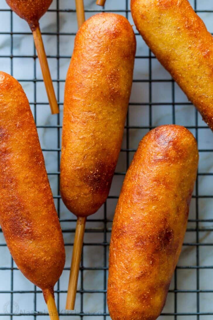 Я придумал этот рецепт много лет назад, потому что мне очень нравились корн доги, которые я покупала на улице, но я не могла найти рецепт для них. А теперь я поделюсь им с вами. Отлично подается с горчицей. Ингредиенты: 1 чашка желтой кукурузной муки 1 стакан универсальной муки ¼ чайной ложки соли ⅛ чайная ложка черного перца ¼ стакана белого сахара 4 чайные ложки разрыхлителя 1 яйцо 1 стакан молока 1 литр растительного масла для жарки 2 упаковки (16 унций) говяжьих сосисок 16 деревянных шампуров Как приготовить: Шаг 1 В миске смешайте кукурузную муку, муку, соль, перец, сахар и разрыхлитель. Добавьте яйца и молоко и все перемешайте. Шаг 2 Разогрейте масло в глубокой кастрюле на среднем огне. Вставьте деревянные шпажки в сосиски. Обваляйте сосиски в тесте до тех пор, пока они не будут хорошо покрыты. Шаг 3 Жарьте 2 или 3 кукурузных сосиски за раз, пока они не подрумянятся, около 3 минут. Положите их на бумажные полотенца что-бы масло стекло. Приятного аппетита!