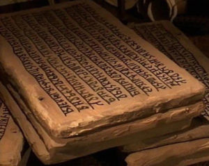 Арабский писатель Ибн ан-Надим в «Книге росписи известий об учёных и именах сочинённых ими книг» (987 — 988 гг.) сообщает: «Русские письмена. Мне рассказывал один, на правдивость коего я полагаюсь, что один из царей горы Кабк (Кавказ) послал его к царю Русов; он утверждал, что они имеют письмена, вырезываемые на дереве. Он же показал мне кусок белого дерева, на котором были изображения, не знаю были ли они слова, или отдельные буквы, подобно этому».