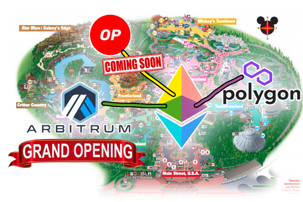 Сейчас экосистему Ethereum можно сравнить с Диснейлендом 50-х. Первый Диснейленд открылся в Анахайме (Калифорния) в 1955 году и довольно долгое время был единственным в мире парком компании Уолт Дисней. Сеть Ethereum в ее текущем виде также является главным и единственным хабом, где кипит вся активность экосистемы. Иными словами, когда вам хочется “посетить” Ethereum, то вы, как и все остальные посетители, съезжаетесь в один и тот же “парк” (сеть) и пользуетесь одними и теми же “аттракционами” (DeFi-приложениями).