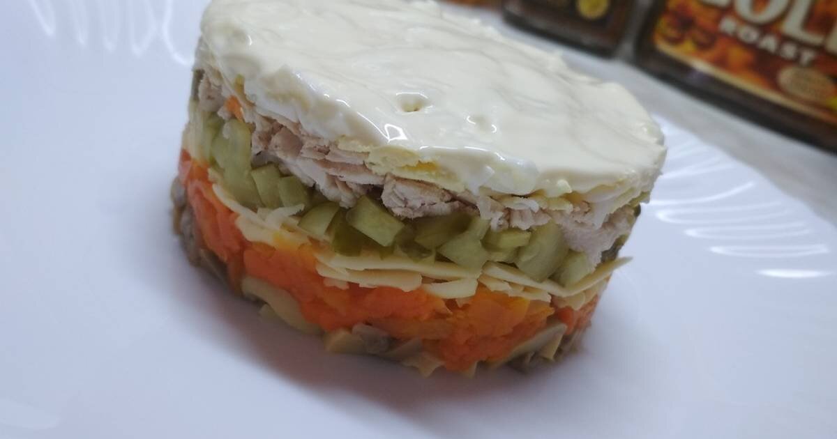 Ингредиенты: Картофель отварной — 4 Штуки Грибы маринованные — 200 Грамм Лук репчатый — 1 Штука Яйца вареные — 3 Штуки Мясо отварное — 250 Грамм Огурец соленый — 2 Штуки Морковь отварная — 1 Штука Сыр — 100 Грамм Майонез или сметана — По вкусу Перец черный молотый — По вкусу Соль — По вкусу Картофель трем на крупной терке и добавляем к нему немного майонеза, перемешиваем. Отварную морковь так же натираем и смешиваем с майонезом. Теперь измельчаем яйца (можно так же на крупной терке). Добавляем майонез, перемешиваем. Затем трем на крупной терке сыр, но к нему майонез добавлять не надо. Грибы нарезаем мелко. Репчатый лук режем на небольшие кубики и обдаем кипятком. Соединяем грибы и лук, заправляем майонезом, перемешиваем. Далее измельчаем соленые огурцы Нарезаем мелко отварное мясо и смешиваем с майонезом. Приятного аппетита!