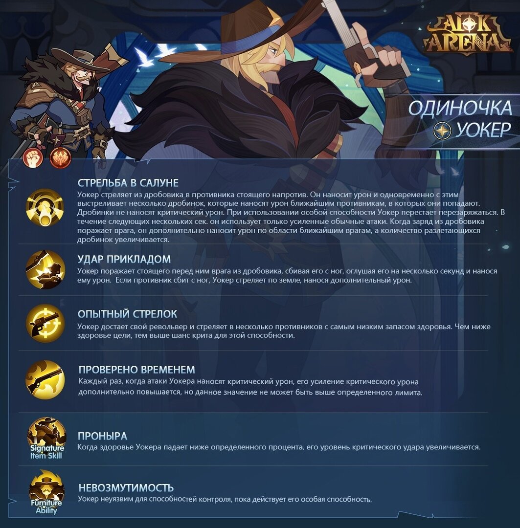 Вот и долгожданный новый герой "Одиночка Уокер" из фракции носители света. Ниже вы можете прочитать о его способностях. В кратце я напишу о способностях ниже. 1скилл(стрельба в салуне) - Уокер стреляет в противника напротив и дробинки наносят урон другим врагам. 2скилл(удар прикладом) - оглушает противника напротив, сбивая его с ног, если противник упал, то наносить доп урон 3скилл(опытный стрелок) - стреляет по противникам с самым низким запасом здоровья, чем ниже, тем выше шанс крита 4скилл(проверенно временем) - после каждого крита, то с каждым разом крит дополнительно повышается Signature item skill - когда уровень здоровья падает до какого значения, то шанс на крит увеличивается Furniture ability - Уокер будет неуязвимым для взятия его в контроль, пока действует его способность