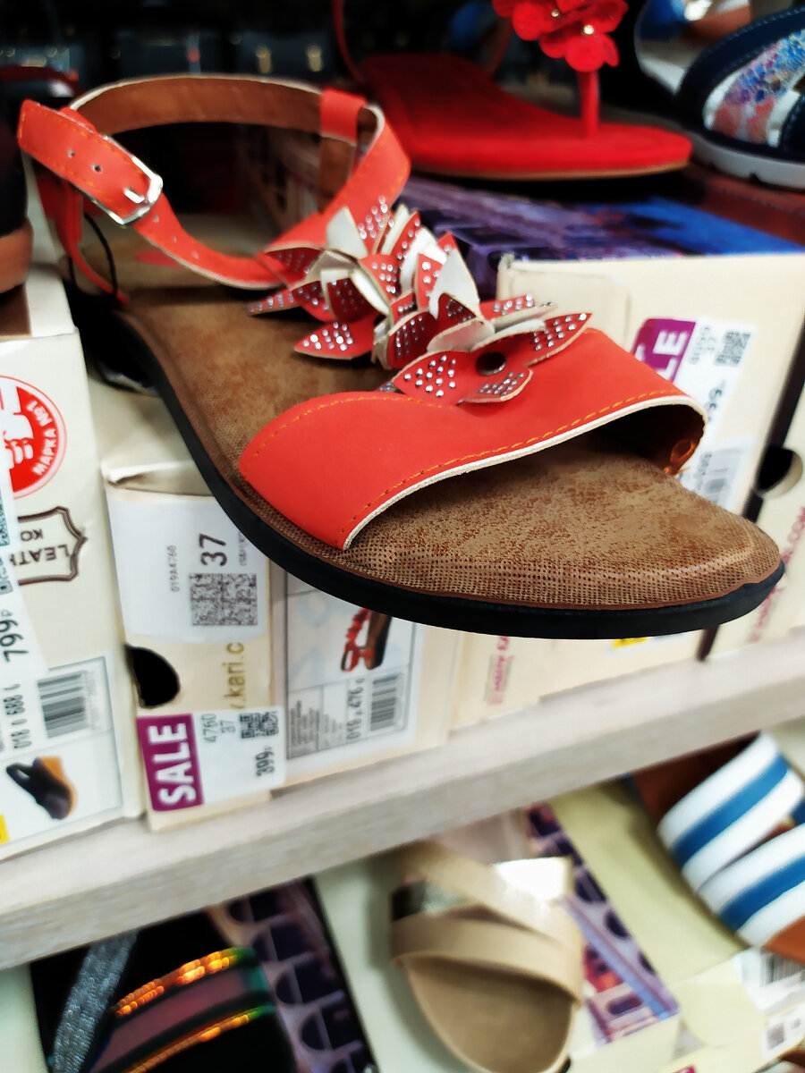 Прогуливаясь со своей давней подругой по магазину обуви KARI, я стала ей предлагать на выбор разные босоножки и сандалии на её ногу. Но она пунктуально отказывалась если видела ценник дороже 1000 рублей. И сказав мне, что не может пока позволить себе, что-то дорогое потянула меня к полкам с низкими ценами. В этом обзоре хочу предложить вашему вниманию недорогие летние модели обуви, которые попались мне в KARI. И так, город Новороссийск. Красные сандалии с декоративным цветочным украшением на подъёме. Цена 399 рублей. Серебристые сандалии на тонкой подошве. Цена 799 рублей. Голубые сандалии с фигурной перфорацией и застёжкой на липучке. Цена 599 рублей. Лёгкие прогулочные бело-коричневые сандалии с переплетением. Цена 399 рублей. Простые чёрные сандалии на резинке. Цена 799 рублей. Сандалии с цветными ремешками на рельефной подошве. Цена 399 рублей. Бежевое сабо с перфорацией на устойчивом каблуке. Цена 599 рублей. А это самые дешёвые прогулочные шлёпанцы через палец, по цене 199 рубле