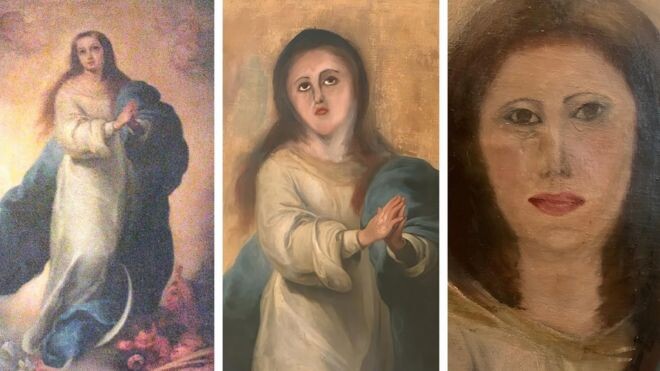 Для начала уточним , что же такое реставрация . Реставрация - Восстановление обветшалых или разрушенных памятников искусства в прежнем, первоначальном виде. Безусловно хочется сохранить предметы искусства прошлых лет в их первозданном виде, но какова же вероятность стереть во время реставрации всю индивидуальность и красоту произведения ? В сегодняшней подборке я покажу вам несколько картин, которые уж лучше бы не трогали , не будем долго тянуть и пожалуй начнем . 1. В Испании неудачной реставрацией испортили картину "Непорочное зачатие" художника эпохи барокко Бартоломе Эстебана Мурильо. Частный коллекционер из Валенсии заплатил 1200 евро за то, чтобы исправить неудачную попытку реставрации, но, несмотря на две попытки сделать это, картина осталась измененной до неузнаваемости. 2. В 2012 году пожилая прихожанка попыталась восстановить ценную фреску Иисуса Христа в своей местной церкви возле Сарагосы. Но ее работа привела к тому, что картину окрестили "Пушистый Иисус". 3. Стату