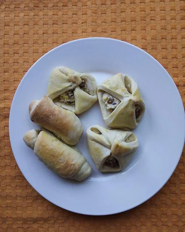 Ингредиенты:Тесто слоёноеТворогИзюмСахарПриготовление:Творог смешать с сахаром и изюмом, всё хорошо перемешиваемТесто раскатываем, начиняем,форму делаем по своему желанию, затем выпекаем в духовке, минут 15, при температуре 190грПолучается вкусно, просто и полезно!