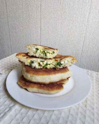 К кефиру добавила соль, сахар, соду, масло, все хорошо перемешала и добавила муку. Затем раскатала тесто на столе, добавляла при этом ещё муку. Разделила тесто на 6 равных частей. Каждую из частей разделила пополам и раскатала, на одну часть положила начинку из яйца и лука, и закрыла второй частью теста и соединила края. Обжарила на масле с двух сторон до золотистого цвета.