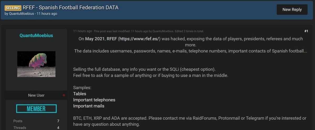 В Испании произошла очень мощная утечка личных данных сотен футболистов, арбитров, рядовых работников и топ менеджеров футбольных клубов. Сайт Королевской испанской футбольная федерация (Real Federación Española de Fútbol, аналог нашего РФС) накануне подвергся серьезной хакерской атаке. Итогом которой оказался выставленная на продажу в даркнете база данных. Продавцы утверждают , что дамп содержит имена, логины и пароли, личные телефоны и эмэйлы футболистов и работников клубов. В качестве доказательства в сеть выложили информацию с личными данными арбитров обслуживающих испанский чемпионат. Конечно сейчас, доподлинно неизвестно содержаться ли там данные топовых испанских клубов , в частности Барсы и Реала.