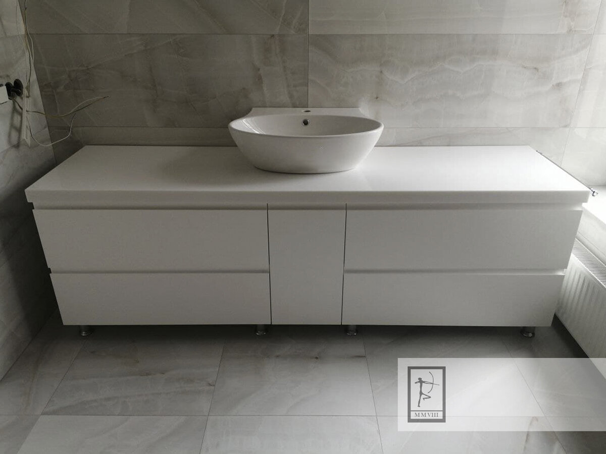 Приветствую вас, друзья! Тумба с раковиной в ванной. Практически в каждой ванной устанавливают тумбу с умывальником. Главной особенностью этого вида мебели выступает то, что тумба отлично подходит для хранения белья, средств гигиены или бытовой химии. Чаще имеет распашные двери и полочки внутри, но встречаются модели и с выдвижными ящиками. Такая мебель обладает несколькими преимуществами: Практичность. Позволяет рационально использовать пространство под раковиной. Эстетичность. Сифон и иные коммуникации прячутся в тумбе, а поэтому не видны. Удобство. Необходимые предметы для проведения гигиенических процедур всегда под рукой. Столешница изготовлена из искусственного камня. К плюсам можно отнести малый вес, устойчивость к воде, агрессивной среде и перепадам температур. Нередко эти материалы имитируют натуральный камень, древесину или другие природные материалы, поэтому придают ванной комнате особого изыска и престижности, при этом сохраняя практичность и удобство. В нашей ванной прин