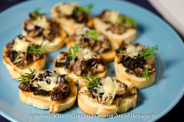 Зима – время сушеных грибов. Оказывается, из них столько блюд можно приготовить. Не знала, пока не начала готовить по “Книге о вкусной и здоровой пище”. А что-нибудь запечь под сыром в нашей стране очень любят, вот и в книге предлагается вариант горячей закуски, в котором грибы запекаются под сыром. Кстати, очень вкусно! Хотя разве могло быть иначе? Но! В книге грибы подвергаются тепловой обработке 4! раза. Я готовила по рецепту, но время варки/жарки/тушения/запекания сократила. Чего их мучить, ежели они и так готовы. В качестве основы я использовала не кружочки из батона, а ломтики мини-багета. На 24-25 ломтиков мини-багета: Сушеные грибы отварить до мягкости, вынуть из отвара (отвар не выкидывать!) и обжарить в растительном масле. Лук измельчить и обжарить до мягкости. Смешать грибы и лук. Растереть муку и сливочное масло, разбавить их 1 ст.л. грибного отвара и сметаной. Хорошо размешать. Сложить грибы с луком в кастрюлю или сотейник, залить полученным соусом, заправить солью и перце