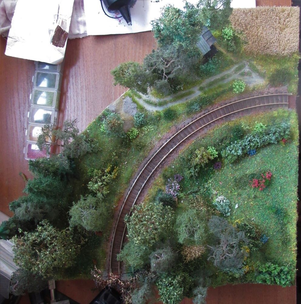 Ну вот, закончил посадку растительности внутри радиусного пути. Теперь ее "упорядочность" почти незаметно. Убраны, всех смущающие шурупы, которые держали пути. Вид сверху: Так это выглядит с одной стороны: И с другой стороны: А здесь видно, что пластиковые деревья проявляют свою "пластиковость" на просвет. Придется еще что-то добавлять, чтобы это выглядело натуральнее Здесь вроде все нормально Пути обработал пастелью. Теперь надо модуль очеловечить. У меня была модель старого комбайна. А на двух модулях - пшеничное поле. Сам бог мне велел поставить этот комбайн на макет. Перед установкой я его "состарил" (смотри "Техника на макете" ). Помните, раньше я поставил на модуле маленькую хижинку. С одной стороны - это хорошо, макет на котором был только один лес, сразу ожил. С другой стороны, эта хижина по смыслу никак не вяжется с темой макета. На модуле нет ничего, что могло бы обосновать ее появление. Но, раз поставил - так поставил. Тему расстановки старого комбайна подсказало видео, где