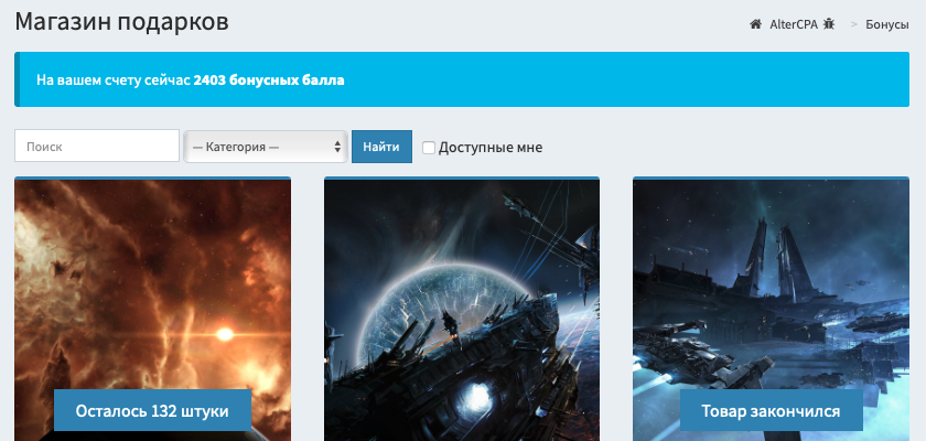 - Накопленные баллы веб-мастер может потратить в магазине бонусов. В нём администраторы размещают доступные к покупке товары. Некоторые товары могут быть представлены в ограниченном количестве.