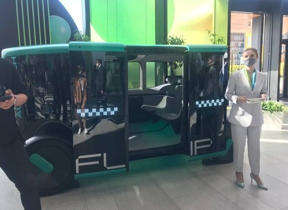 Компания «Сбер-Автотех», входящая в экосистему «Сбера», представила на ПМЭФ-2021 прототип полностью автономного электрического транспорта собственной разработки под названием «ФЛИП». Посетители петербургского форума смогли ознакомится с шестиместным беспилотным транспортным средством. Платформа для электромобиля является собственной разработкой компании. Она имеет модуль сменных батарей питания, электродвигатель и систему распознавания лиц. Кроме того, компоновка «ФЛИПа» позволяет использовать также газ и водород в качестве источника энергии. Испытать в действии беспилотник от «Сбера» гостям форума не удалось, организаторы ПМЭФ-2021 запретили транспортному средству передвигаться по площадкам. Разработчик «Сбер-Автотех» предлагали заинтересованным посетителям только посидеть внутри автономного электромобиля, который возможно в будущем появится на российских дорогах в качестве роботакси или беспилотного постамата.