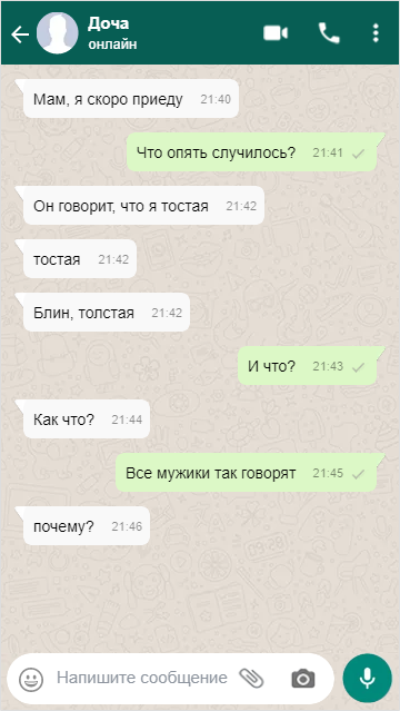 Здравствуйте! У меня есть хорошая знакомая, которая недавно выдала замуж дочку. Мы с ней работаем вместе в одном кабинете. У неё всё время меняется лицо, когда приходит ватсапп сообщение от её дочери. Как-то на обеде она просит у меня совета, что дочка постоянно чуть - что пишет сообщение. Когда я посмотрела на эти сообщения, то была в каком-то ступоре. С её согласия решила выложить это. Вот посмотрите: Дальше посмотрите их диалог. Поражаюсь выдержке мамы, которая спокойно отвечает на все вопросы дочери. Мы же любим своих детей. Всё время их поддерживаем. У нас же воспитание советское. Что скажут родственники? Как в глаза глядеть друзьям, коллегам по работе? Вдруг дочка вернется обратно домой? Это же позор? У нас в мыслях не было вернуться обратно в родительский дом, тем более разводиться. Давайте дальше смотреть. В начале семейной жизни у всех все хорошо. С течением времени начинает проявляться истинное лицо каждого из сторон. Я считаю, залогом счастливой семейной жизни – это полное