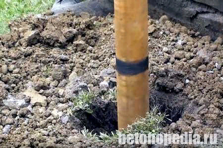 - Заранее приготовленную бетонную смесь для заливки столбов удобнее перемещать в оформленную скважину при помощи воронки. Пропорции компонентов стандартные: 1 часть цемента – 3 части песка – 5 частей щебня. Раствор под своей тяжестью заполнит внутреннюю полость рубероидной трубки. Поможем ей это сделать наиболее полно штыкованием.