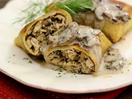 Для самих блинов нам понадобится: светлое пиво 350мл, мука 200гр, 3 яйца, 150гр сметаны, половина чайной ложки соли, половина чайной ложки сахара. Процесс приготовления Соединяем яйца и сметану, взбиваем. Вливаем пиво и снова взбиваем. Добавляем муку, соль, сахар, тщательно перемешиваем. Если будет слишком густо, можно добавить ещё пива. Жарим как обычные блины. Жюльен Состав: 500 гр куриного филе, 300гр шампиньонов, 200-250мл сливок жирностью не меньше 20%, соль, перец, зелень. Сначала нам нужно порезать курицу и шампиньонами средними ломтиками. Зелень порубить (можно взять петрушку, укроп, шпинат). На разогретую сковороду с маслом выкладываем крицу, обжариваем ее на большом огне так, чтобы она оставалась немного сыроватой. Так курица будет достаточно сочной. Добавляем грибы, немного обжариваем. Добавляем зелень, тщательно мешаем и жарим примерно 1-2 минуты на среднем огне. Вливаем сливки, солим и перчим. Помешивая, томим на среднем огне, пока сливки не загустеют. Начинка готова! Те