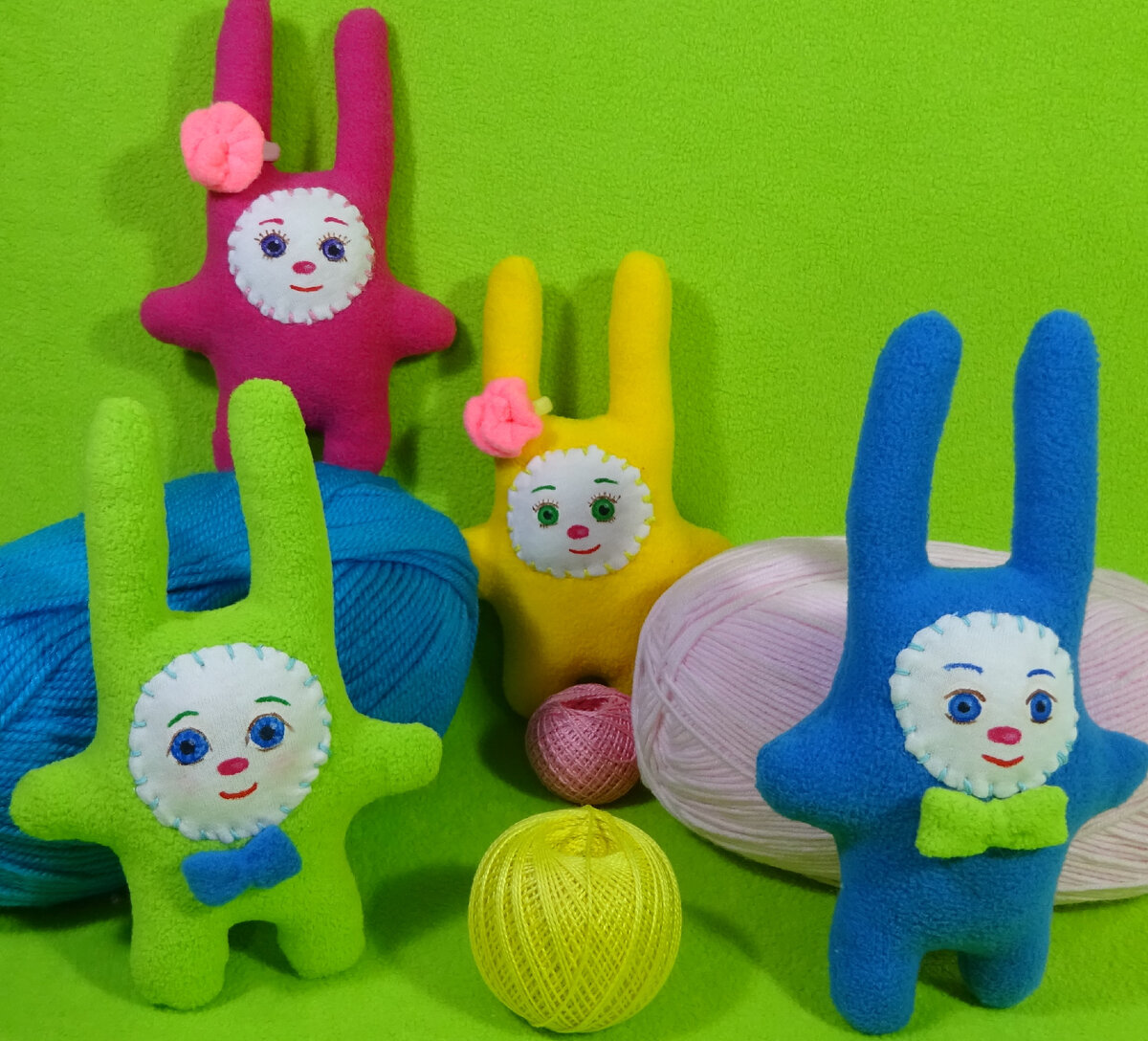 На моей аватарке изображены весёлые зайчики, которых я пошила. Почему же они такие яркие? Они такие яркие потому как я шила их по совету моих детей, они попросили сделать игрушки яркими и не сложными, вот такие зайчишки у меня и получились. На просторах интернета я нашла примерно то, что хочу пошить. Сделала выкройку и пошила. Весёлые зайчики, яркие и очень милые получились. Конечно, я обычно работаю в более постельных тонах, не таких ярких, но глядя на этих зайчиков у меня всегда повышается настроение, мне хочется творить и создавать. Пошиты игрушки из нежного флиса, этот материал мне очень нравиться и я часто использую его в своем творчестве. Он универсален, подходит как для изготовления игрушек, так и для изготовления сумок и разных вещей. Очень быстро можно пошить таких зайчишек буквально в считанные минуты. Так что запасайтесь флисом, выкройку такую каждый может нарисовать и вуаля, через некоторое время у Вас получится весёлый зайчик. Если Вам понравилась статья ставьте лайк!