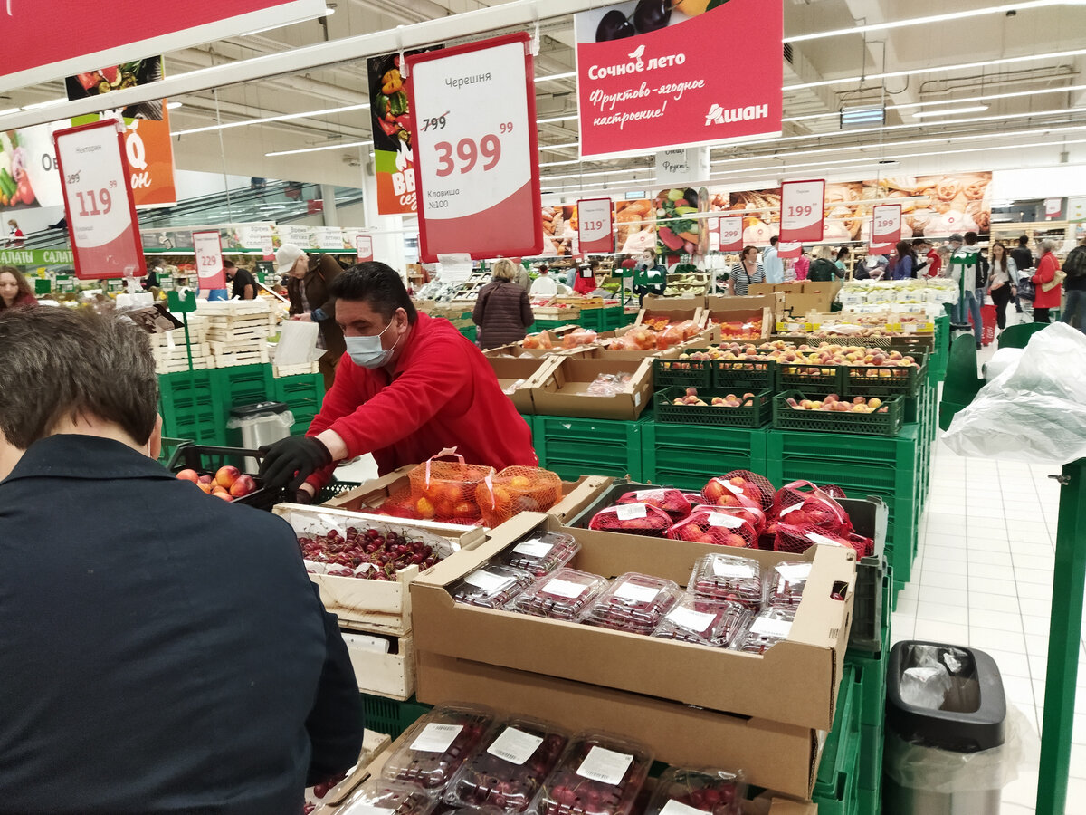 Зашли в Москве в Ашан и посмотрели, сколько стоят овощи и фрукты ( черешня по 400, персики по 200 рублей)