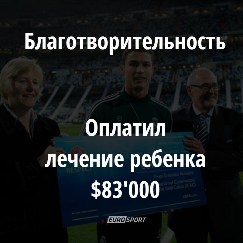 Роналду щедро раздает деньги организациям и людям, которые в них гораздо сильнее нуждаются: 100 тысяч долларов «Красному кресту», 150 тыс. евро госпиталю в Мадейре. В 2012-м Криштиану за полтора миллиона фунтов продал на аукционе золотую бутсу, которую он выиграл в 2011-м. А потом пожертвовал деньги палестинской школе в Секторе Газа. Но окончательно зафиксировала нимб на голове португальца другая история. В марте 2014-го к Роналду обратилась семья болельщиков «Реала», в которой родился тяжело больной ребенок. Маленькому Эрику Ортизу-Руису нужна была срочная операция на мозге. Родители мальчика попросили у лидера любимого клуба пару бутс для аукциона, чтобы собрать деньги. Криш не только оплатил расходы на операцию (50 тысяч долларов), но и покрыл курс реабилитации (5 тысяч долларов за сеанс).