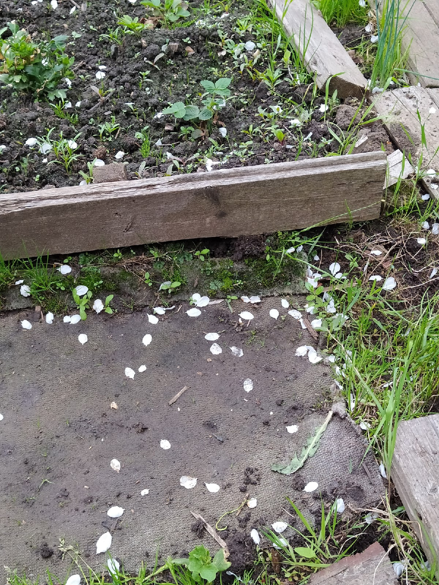 У нас в Подмосковье наконец-то лето. Не жарко, 21-22 градуса, и северный ветер, но солнечно и угроза ночных заморозков миновала. Нас сильно ими пугали, мы все что могли назакрывали пленками и спанбондом, переживали, ведь много уже высажено и начало активно расти, но ничего, все живо-здорово. Сейчас бы нам еще дождиков, но и то хорошо, что не ездим закрывать-открывать парники. Яблони, вишни и сливы отцвели, облетают последние белые лепестки. Клубнику замульчировали опилом. Цветет не плохо, достаточно дружно: Пока шли заморозки, травы выросло столько, что полем с мамой в четыре руки и траву носим ведрами на компостную кучу. Картошку тоже немного присыпали опилом и уже подкучили, лук вот пропололи, помидоры отстояли заморозки под пленкой и уже цветут и завязали первые плоды, в правом маленьком парничке еще не вся высаженная рассада капусты и подсолнухов: Воткнули палочки в горох и бобы, бобы очень дружно взошли из своих семян, а горох покупной и так себе, чеснок у нас зимний, пропололи и