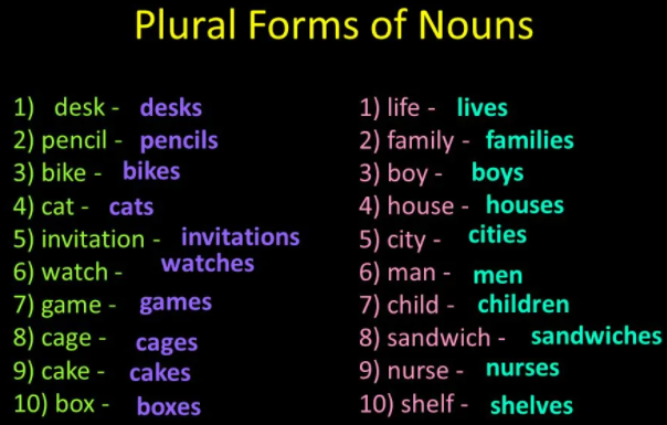 1. Множественное число существительного образуется путем добавления окончания –s: a car – cars a dog – dogs a house – houses an apple – apples 2. Если существительное заканчивается на: -s, -ss, -ch, - sh, -x, -z, -o добавляем окончание -es a bus – buses a kiss - kisses a match – matches a dish – dishes a box – boxes a buzz – buzzes a potato – potatoes Исключения на –o: a piano – pianos a photo – photos a video – videos a kilo – kilos a radio – radios a zoo – zoos 3. Если существительное заканчивается на: согласная + y = меняем –y на –i+es a fly – flies a baby – babies a cherry – cherries гласная + y = добавляем только –s a day – days a boy – boys a key – keys 4. Если существительное заканчивается на –f, -ef меняем –f, -ef на –v+es a wife – wives a leaf – leaves a life – lives Исключения: A giraffe – giraffes A roof – roofs Слова исключения: a man – men (мужчина – мужчины) a woman – women (женщина – женщины) a child – children (ребенок – дети) a person – people (человек – люди) a mous