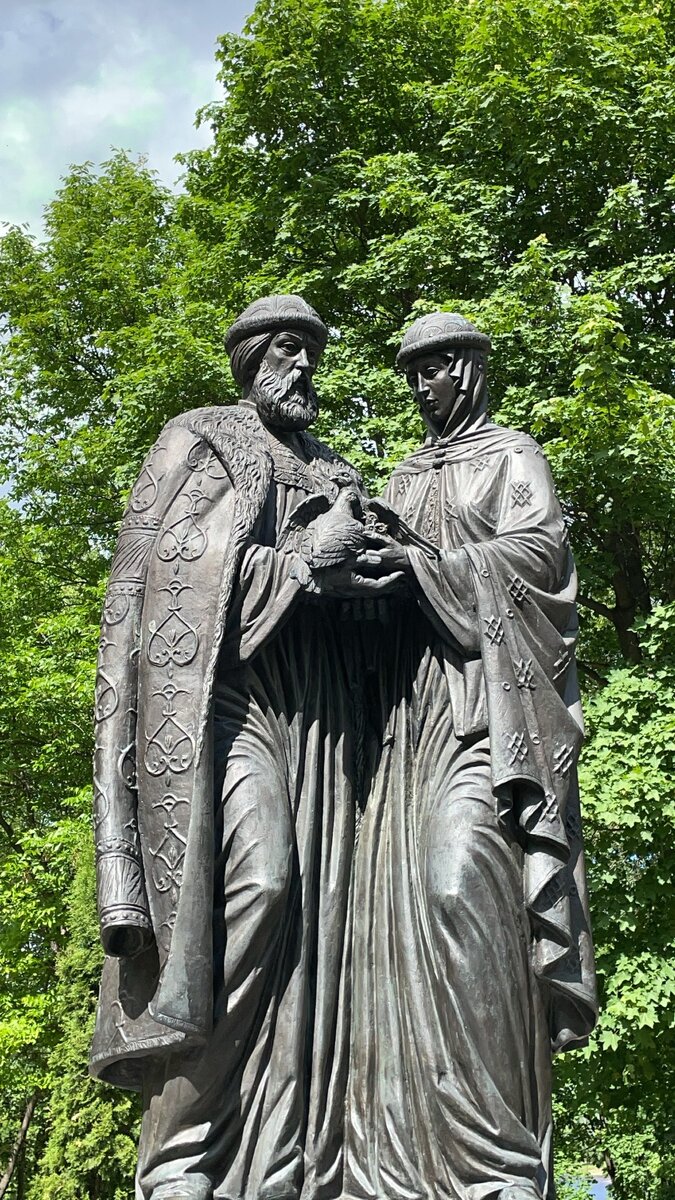 В Александровском саду нашего города поставлен памятник Петру и Февронии, как символ семьи, любви и верности. За спинами пары сидит заяц, ему все трут нос и кладут на голову монеты. Наверное, чтобы любовь и верность и с ними пребывали всегда. Раньше я не задумывалась, почему заяц, а не кот или собака, либо другое домашнее животное, пока сегодня ко мне не подошёл мужчина с вопросом, что же этот заяц символизирует. Оказывается, по преданию, Феврония была целительница, травница и могла приручать диких животных. Думаю, именно эту способность, способность приручать и исцелять, и символизирует этот зайчишка. 8 Июля отмечается праздник семьи, любви и верности. Эта дата связана с днём памяти Петра и Февронии, которые жили счастливо и умерли в один день. Предание гласит, что Пётр был болен не излечимо, по тем временам, когда ему приснился сон о том, что его может спасти девушка по имени Феврония. Сразу же был объявлен поиск девушки, носящей такое имя, с обещанием если она исцелит моло