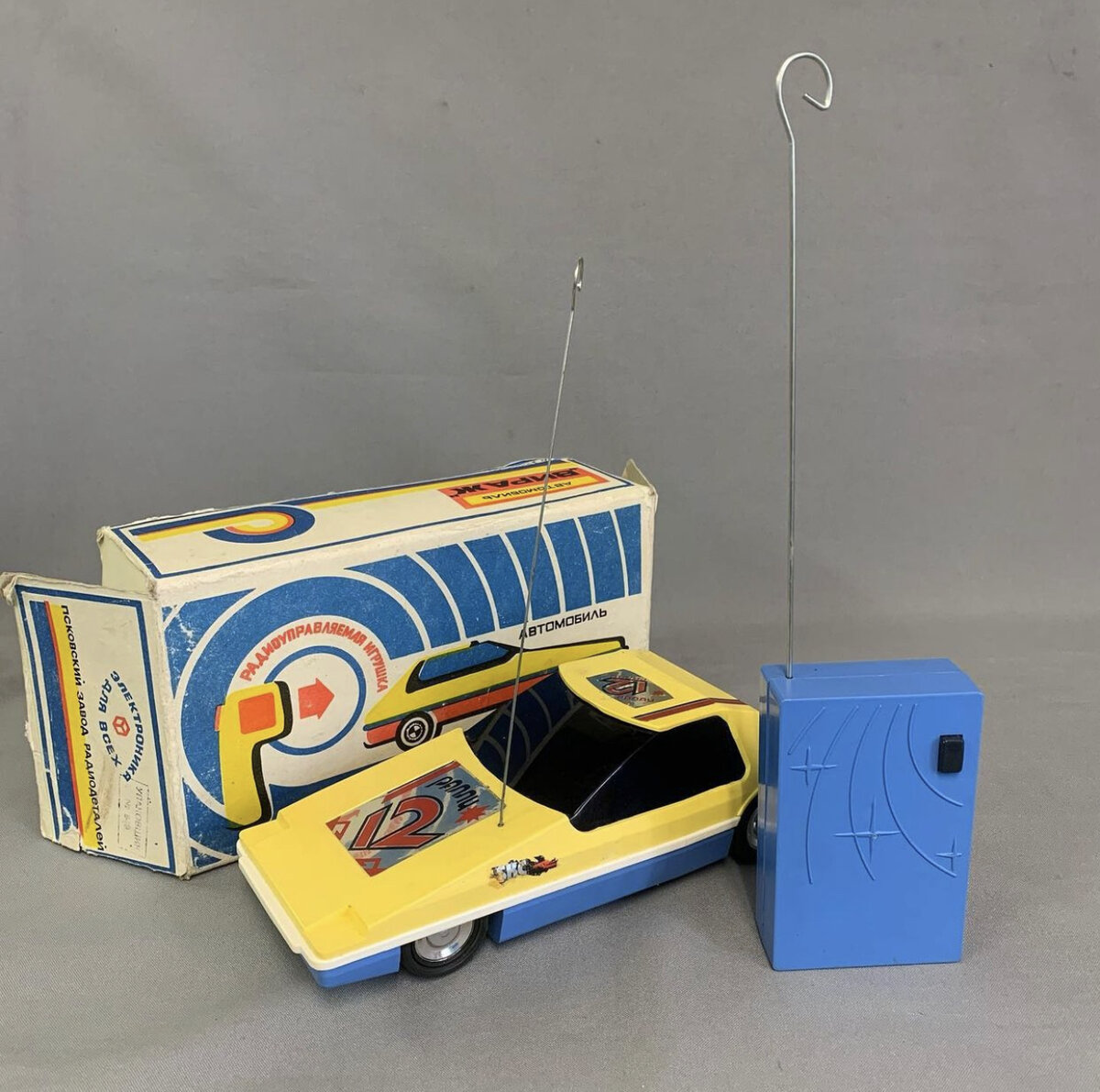 Привет, дорогие друзья. Так получилось, что на днях у меня появилось несколько интересных моделей игрушек времен СССР. Для любителей понастальгировать и вспомнить свое советское детство, давайте я вам расскажу про некоторые из них. 1. Это радиоуправляемая игрушка "Вираж" из серии Ралли-12 в оригинальной коробке. На коробке стоит штамп, когда была выпущена эта игрушка - 1 августа 1989 года, стоила она 13 рублей и была произведена на Псковском Заводе радиодеталей. В годы СССР этот завод был крупнейшим в Псковской области и считалось, чт производил продукцию для обороны страны. Но это было не совсем так, оборонных заказов было не более 20%, все остальное делалось для гражданских нужд, в том числе и игрушки, из которых большинство было радиоуправляемыми. Машинка управлялась дистанционно за счет передатчика сигналов управления, которая присутствует в данном наборе, вы видите на фотографии. В интернете остались даже инструкции в которых подробно озвучено, что входит в комплект: автомобиль