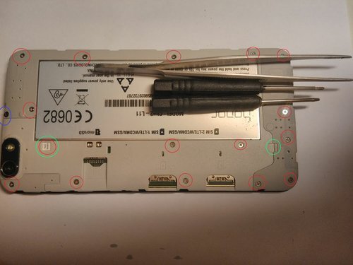 Шаг 1 Чтобы заменить дисплей в Huawei Honor в Москве самостоятельно, Вам понадобятся: Для начала нужно снять старый дисплей Huawei 4X. Выключайте телефон. Мы рекомендуем осуществлять замену экрана сразу со всем дисплейным модулем в сборе. Шаг 2 Замена стекла начинается со снятия задней крышки. Затем вытащите СИМку и SD карту. Теперь нужно открутить 17 винтиков. На фото отмечены зеленым два гарантийных стикера, порвав которые, вы аннулируете гарантию на телефон. Красным на фото указаны 16 одинаковых винтов, а синим одинTorx винтик. Открутите все винтики. Затем с помощью пластикового инструмента прогуляйтесь по периметру телефона, тем самым отцепляя защитную крышку. Шаг 3 Первым делом, добравшись до внутренностей телефона, отцепите шлейф аккумулятора. После чего, совсем чуть-чуть, прогрейте аккумулятор, дабы ослабить клеевой слой, и извлеките его из устройства. Шаг 4 Отцепите 3 шлейфа, отмеченных красным на фото. Синим отмечены 3 пластиковые клипсы, удерживающие материнскую плату. А зеле