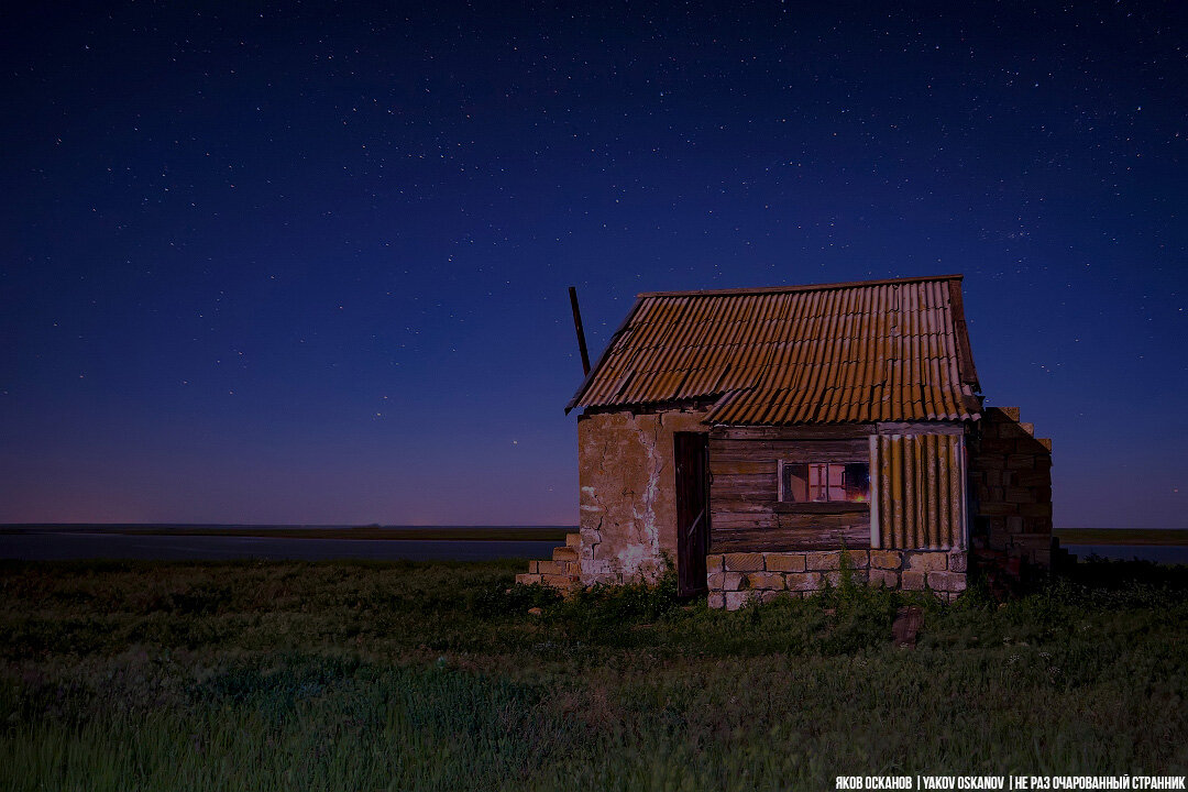 Домик мне показался неплохим, да немного ветхий, но вполне себе годный, чтобы укрыться от степного ветра и непогоды. Сложенный из местного ракушечника, с жёлтой от лишайников крышей, он выглядел даже колоритно среди цветущего степного разнотравья. В нём и решил заночевать. Но, давайте обо всём по порядку. Место действия – остров Водный, который находится посреди вод безжизненного солёного озера Маныч-Гудило. Остров этот необитаем. Вернее будет сказать – люди на нём не живут. Зато живут уже около семидесяти лет одичавшие лошади, наши донские мустанги. Их то я и приехал снимать. Денёк выдался погожим, и я до самого вечера снимал этих чудесных животных, дождавшись великолепного заката с контровым светом. Собственно, вы можете полистать галерею и посмотреть на что это похоже. С наступлением темноты я вернулся в домик, поужинал и решил сделать несколько фото самого домика. Ночь стояла замечательная, безоблачная, и Млечный Путь пусть ещё не такой яркий в это время года, всё же уже врезался к