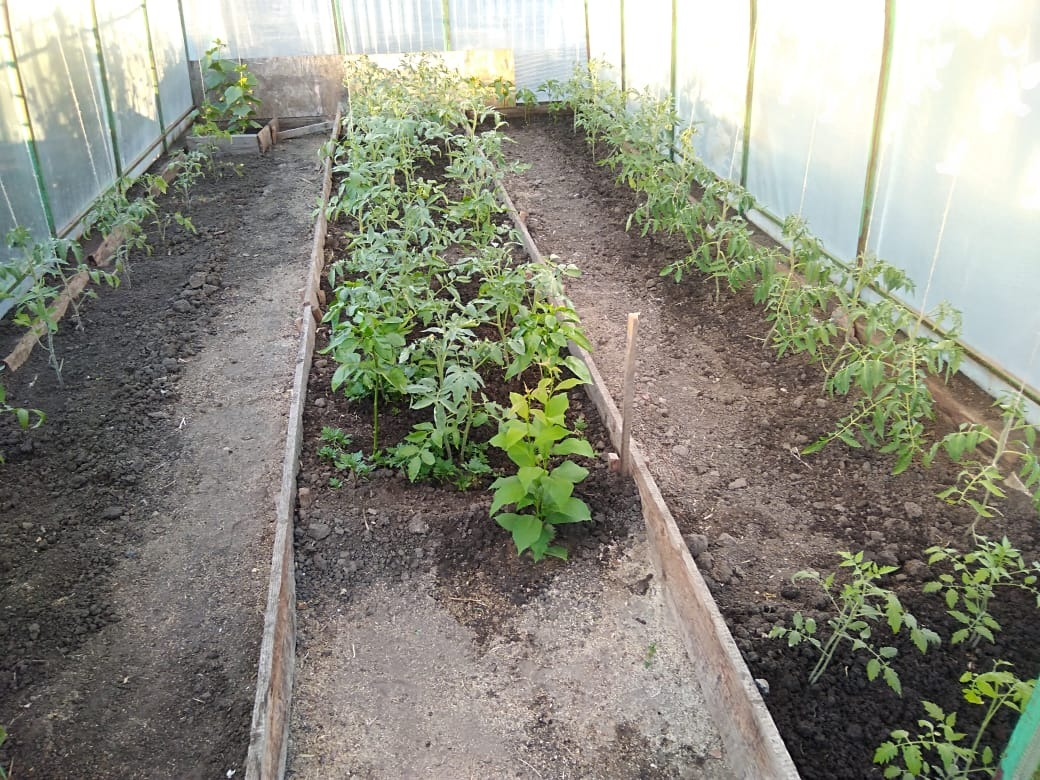 Самые слабые перчики решила посадить в теплицу, выделив им еще один угол. И еще несколько кустов подсадила между томатами в центральной широкой гряде: