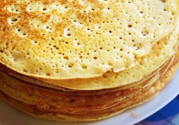 Отличный рецепт для тех, у кого непереносимость куриного белка или для тех, кто просто не любит и не ест яйца. А иногда бывает, что хватишься, а их просто забыли купить. Вот и приходится как-то выкручиваться. Так и появился этот рецепт и пришелся по вкусу очень многим хозяюшкам. Ингредиенты Приготовление: В кефир сразу же всыпаем просеянную муку, подсластим сахаром, посолим. И начинаем хорошо и тщательно перемешивать. Блинное тесто должно выйти по густоте как жирная сметана, однородное, без комочков. Кладем в тесто соду и частями, постоянно помешивая, выливаем кипяток. Тесто начнет пузыриться на глазах, это реакция кипятка с содой, она сразу же гасится и выделяет газ. Тесто готово для жарки. Раскалим сковороду и смажем ее подсолнечным маслом. Очень красивые дырчатые блины получаются . Обжариваем с двух сторон и кушаем с удовольствием!