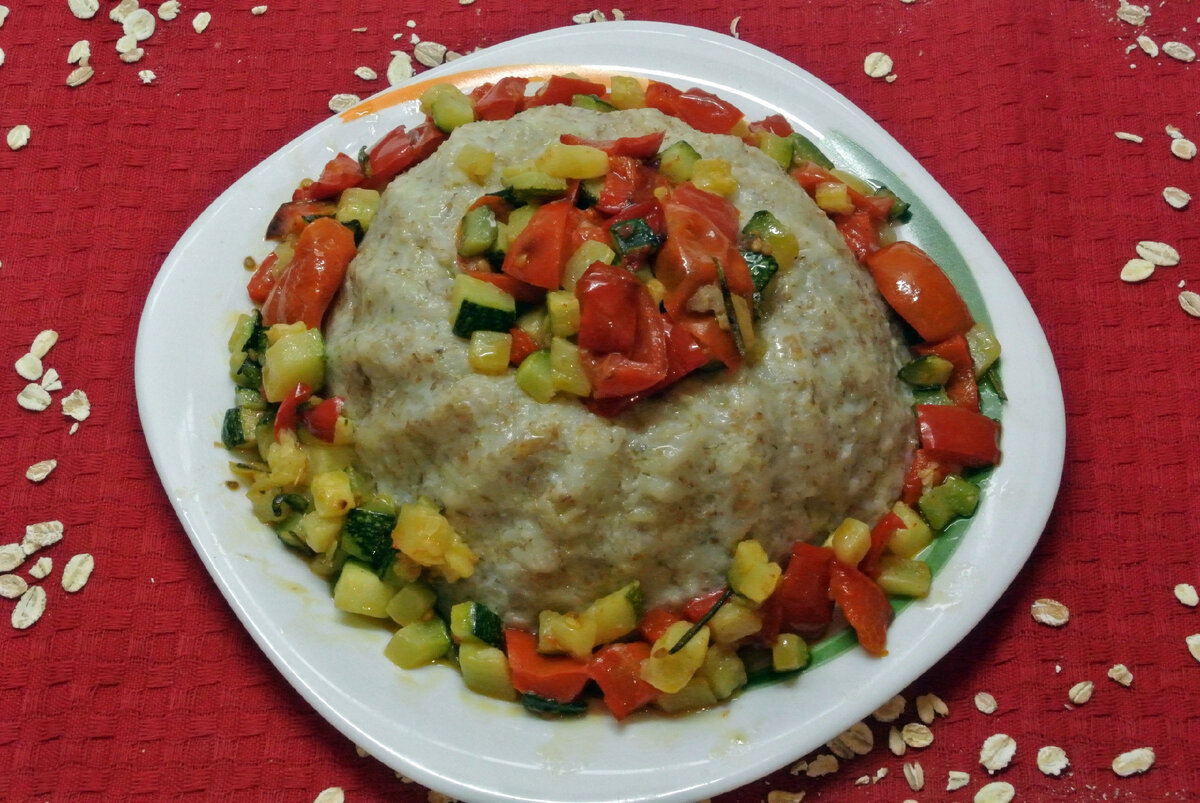Традиционно по утрам у меня овсяная каша 🥧 или каша из 4-5 злаков с различными добавками. Не могла отказаться от такого завтрака, поэтому кашу приготовила на воде, а, чтобы не скучно было есть, дополнила запеченными овощами. Веточка розмарина сделала овощи очень ароматными. Чтобы совсем было интересно, горячую кашу выложила в форму, перевернула на блюдо. И вкус, и внешний вид каши сложился. Ингредиенты: ✅ Овсяных хлопьев - 120 грамм ✅ Помидорок черри - 150 грамм ✅ Цуккини - 300 грамм ✅ Болгарский перец - 1 шт. ✅ Веточка розмарина ✅ Оливковое масло ✅ Черный молотый перец ✅ Соль Приготовление: Перец и цуккини нарезать кубиками. Черри разрезать на четвертинки. Подготовленные овощи выложить на противень, застеленный бумагой для выпечки. Добавить оливковое масло, черный молотый перец и соль. Завершить овощную композицию веточкой розмарина. Запекать 10-15 минут при 180 С. Сварить кашу в подсоленной воде. Дать настояться минут 5. Я выложила горячую кашу в форму, перевернула на тарелоч