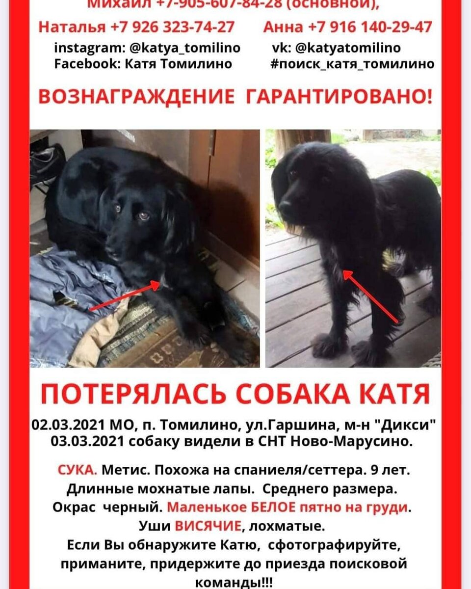 Пропала небольшая черная собака с белым пятнышком на груди зовут КАТЯ. похожа на черного спаниеля, Хвост длинный, пушистый, уши вислоухие, чуть короче спаниелевских. Доброжелательно, но осторожно относится к людям. Привита, не кусается, здорова. Пропала на маршруте Ново Марусино - Томилино, с ней могла случится беда, а может ее подобрали и теперь находится совершенно в другом округе Подмосковья или даже в Москве. На 01.06.2021г. зацепок, очевидцев нет. Очень надеемся на бОльший охват У кого есть связи в ТВ-среде, пожалуйста, пишите на ватсап или позвоните координаторам поиска Анне: +7 916 140-29-47 8 905 607 84 28 Михаил 8-926-323-74-27 Наталия #поиск_катя_томилино #тв #репортаж #розыск #поиск #чп #поможем_вместе Нравится Комментировать Поделиться