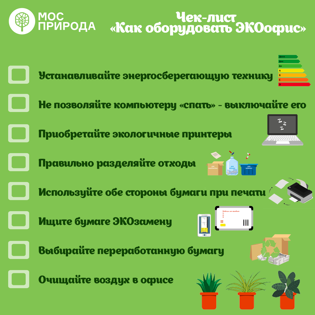 В рамках проекта «Экопривычки от Мосприроды», приуроченного ко Дню эколога, специалисты собрали рекомендации по благоустройству «Зеленого офиса». Мосприрода ко Дню эколога разработала 22 чек-листа на экологическую тематику «Экопривычки от Мосприроды». С 1 по 11 июня они будут опубликованы в соцсетях подразделений Мосприроды и на сайте учреждения - https://mospriroda.ru/important/poleznye_stati/. Эти экосписки помогут начать сокращать свой экослед, сделать первые шаги в сторону экологичного образа жизни и укоренить свои экопривычки. Каждый чек-лист чему-то научит, а также поможет не только сберечь природу, но и собственные финансы. 22 чек-листа от Мосприроды – 22 экошага к сохранению экологии. Чек-лист «Как оборудовать ЭКОофис»: 1. Устанавливайте энергосберегающую технику Использование энергосберегательной техники в офисе позволяет уменьшить ежегодный объем выбросов газов, создающих парниковый эффект. 2. Не позволяйте компьютеру «спать» - выключайте его Не нужно оставлять компьютер в «с