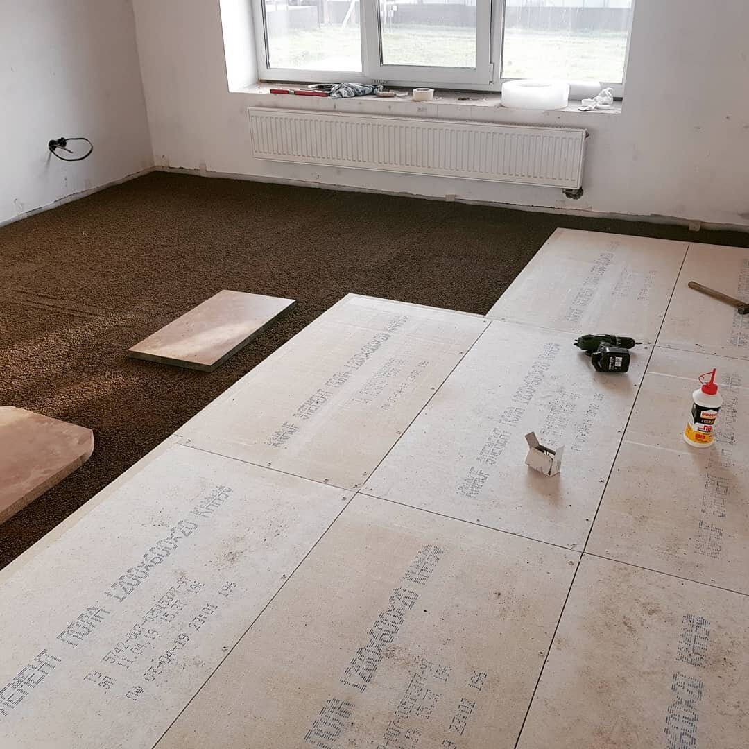 Половина второго этажа у нас сделана в полусухой стяжке пола. А в двух комнатах решили делать сухую стяжку пола из керамзита и листов knauf.
