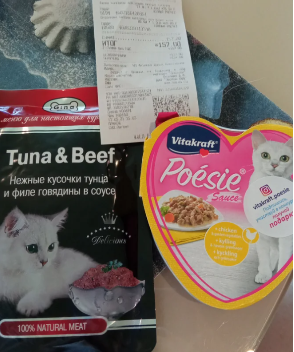 Всем привет, мои хорошие. Была вот такая ситуация со мной, я заказала корм Брит премиум для своей кошечки Бины, и не подумала о дате доставки. А если быть точной, я перепутала даты в голове, и в итоге корм пришёл на день позже, т.е. Сухой корм закончился, и сутки надо чем-то кормить Бину. Я пришла в зоомагазин, на минуточку, это единственный магазин в моем районе. У них не продаётся Брит уже давно. Я попросила их помочь, описала ситуацию и они предложили вот такие питательные корма, в которых 50% мяса в одном, и 50% тунца в другом. Вот фото с чеком, 157 рублей за два товара. Давайте посмотрим составы? Уже видим, что данный корм русифицирован, а значит он не российского производства. Германия, очень гуд. А вот и второй корм. Вы представляете, филе тунца 50%! Это просто идеальный вариант побаловать свою кису! И что я могу сказать вам, положа руку на сердце, он пахнет восхитительно, я бы сама ела такой. Для меня запах кильки в томатном соусе. К сожалению, имею только одно фото дегу