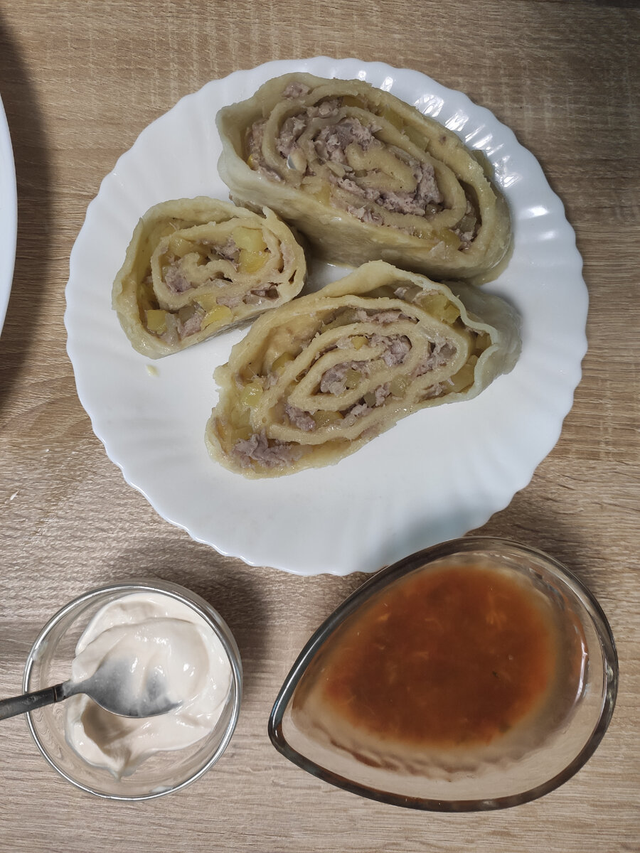 Добрый день друзья. Делюсь рецептом блюда Ханум. Состав: мука, фарш говядина (можно добавить свинины или сделать из баранины полностью), чёрный перец, картошка. Соусы на свой вкус, приятного аппетита!