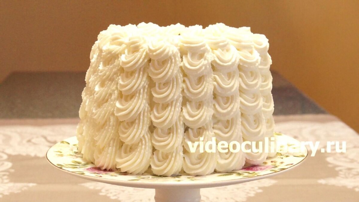 Оставшийся сливочный крем перекладываем в кондитерский мешок с зубчатой насадкой диаметром 1 сантиметр. Круговыми движениями наносим рисунок снизу вверх.