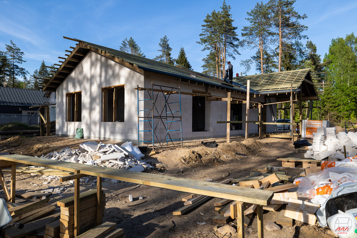 Идёт строительство одноэтажного дома из газобетона на УШП (утеплённой шведской плите) в Елизаветинке Л.О. : Общие габариты дома 8,3*18 м + терраса 3*6 м. Крыша двускатная, угол основной крыши 23,4°, на террасе 29,7°: На момент съёмки идут кровельные работы, давайте посмотрим сверху: На крыше будет металлочерепица МП Ламонтерра-X с покрытием VALORI Grey, пока что монтаж не начался: Ещё несколько фотографий: Обычно мы используем газобетон ЛСР, но здесь стены из газобетона СК. Мы не в восторге от геометрии блоков, они имеют погрешность до 4-5 мм, что затрудняет строительство – приходится больше работать тёрками. Вот такие блоки, заказчик данный материал приобрёл самостоятельно: Необычный момент – столбы на террасе и на крыльце не деревянные, как всегда, а металлические: Балки при этом из клееного бруса: Внутри дома готовы ещё не все перегородки: За счёт этого кухня-гостиная кажется больше, чем будет на самом деле: Перекрытие на момент съёмки ещё не совсем доделано, как видите. Кстати, ещ