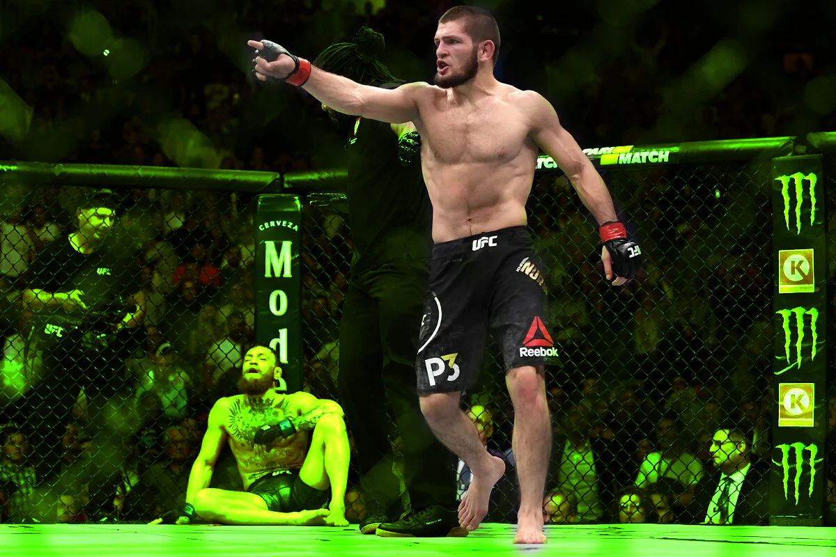 Хабиб Нурмагомедов имеет 0 поражений. Его никто не побеждал на ментальном уровне, то есть в голову ему трудно залезть. Но есть моменты, когда даже Нурмагомедова выводили из равновесия. После боя началась потасовка прямо в зале. Хабиб не выдержал оскорблений, которые выкрикивал Диллон Дэнис, и Нурмагомедов буквально залез на клетку, и хотел спрыгнуть на него, но не попал. Далее, след за Хабибом, на клетку залез Конор, и кто то из команды Нурмагомедова тоже туда залез, и в итоге МакГрегор без всяких разговоров жёстко вломил брату Хабиба. Было просто какое то безумие. Все ринулись в октагон, как со стороны Хабиба, так и со стороны МакГрегора. Хабиба вывели с арены под охраной, также и поступили с Конором. В итоге Хабибу дали пояс только в раздевалке. Знаменитый прыжок Хабиба помнят до сих пор. Была пресс - конференция перед "боем" Тони Фергюсона и Хабиба Нурмагомедова. Оба боца не хорошо высказывались друг про друга. Тони вел себя особенно не сдержано. Было много оскорблений как