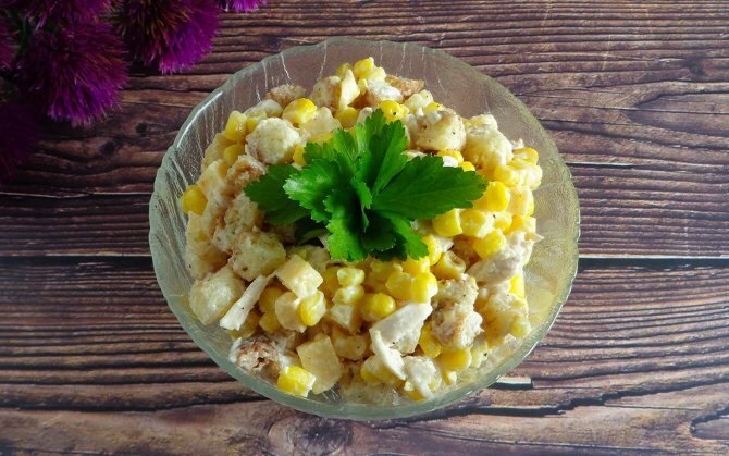 Соль - по вкусу Рецепт: Шаг 1: Сначала отвариваем филе курицы в подсоленной воде. Затем, когда мясо остынет, нарезаем его небольшими кусочками. Шаг 2: Такими же кусочками режем батон (корочку с батона лучше срезать). Затем поджариваем кусочки батона в растительном масле до легкого золотистого цвета. Выкладываем готовые сухарики на салфетку, чтобы убрать излишки масла. Шаг 3: Далее нарезаем сыр мелкими кубиками. Шаг 4: Складываем в миску куриное филе, сыр, сухарики и консервированную кукурузу. Все хорошенько перемешиваем и солим. Заправляем майонезом и сразу подаем к столу. Чтобы сухарики оставались хрустящими, их можно добавить непосредственно перед подачей на стол. Приятного аппетита!