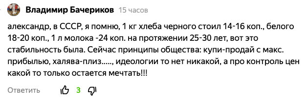 У меня в комментариях многие с ностальгией вспоминают жизнь в СССР - кВтч по 4 копейки, хлеб по 20 копеек, курс ненавистного доллара 60 копеек. [1]