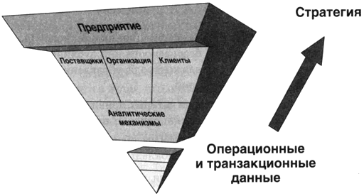 Что бы ни происходило в нижней части, ценность данных растет по мере их использования для анализа и принятия решений. Организации пользуются системами информационных технологий, занимающимися обработкой данных по операциям и сделкам, — планированием и управлением ресурсами предприятия (FRP) или управлением взаимоотношениями с клиентами (CRM), — для выполнения своих рутинных деловых функций. Анализируя данные этих систем, можно разработать пути улучшения работы предприятия.
